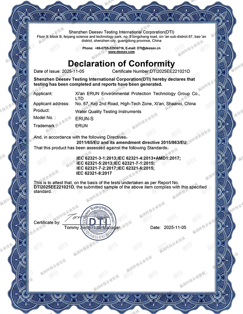 贏潤(rùn)集團(tuán)水質(zhì)檢測(cè)儀獲得RoHS認(rèn)證!國(guó)際化產(chǎn)品合規(guī)再進(jìn)一步!2025年11月05日,西安贏潤(rùn)環(huán)??萍技瘓F(tuán)有限公司(以下簡(jiǎn)稱“贏潤(rùn)集團(tuán)”)正式宣布,其自主研發(fā)生產(chǎn)的ERUN-S系列水質(zhì)檢測(cè)儀器成功獲得RoHS認(rèn)證證書(shū)。這一重要認(rèn)證標(biāo)志著贏潤(rùn)集團(tuán)該系列產(chǎn)品完全符合歐盟2011/65/EU指令及2015/863/EU修正案(即RoHS 2.0指令),同時(shí)在多項(xiàng)國(guó)際檢測(cè)標(biāo)準(zhǔn)上也達(dá)到合規(guī)要求,進(jìn)一步證明了贏潤(rùn)環(huán)保儀器在環(huán)保、安全與國(guó)際化品質(zhì)方面的卓越表現(xiàn)。